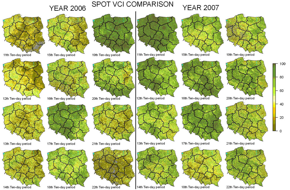 Produkty VEGETATION S-10 i D-10 są pobierane z serwera belgijskiego instytutu VITO. Na stronie http://free.vgt.vito.be/ wybiera się interesujący produkt, obszar pokrycia zdjęć oraz zakres czasowy. W bazie Instytutu znajdują się dane dla lat 1998-2012, czyli okresu pierwszych istniejących od początku projektu do tych na bieżąco aktualizowanych. Dane te są przycinane do obszaru Polski oraz maskowane z wykorzystaniem plików Status Map. To w nich są zawarte informacje o chmurach, śniegu, lodzie, lądzie i wodze. Następnie na podstawie obrazów NDVI wyprowadza się wskaźnik VCI. Na koniec są obliczane średnie wojewódzkie wartości ww. wskaźników. W tym zadaniu wykorzystuje się maskę rolniczą, opracowaną w Instytucie na podstawie klasyfikacji CORINE LAND COVER 2006. Końcowym wynikiem przetwarzania danych SPOT są obrazy pikselowe i wojewódzkie wskaźników NDVI i VCI.