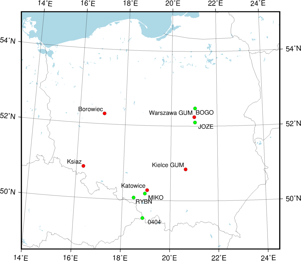 Rys. 1. Punkty pomiarowe planowane w realizacji projektu QuGrav. Punkty laboratoryjne, kolor czerwony, punkty terenowe, kolor zielony.
