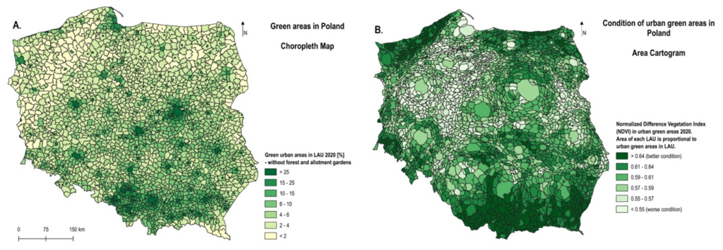 Rycina. Tereny zielone w gminach. A – prezentacja za pomocą kartogramu, B – prezentacja za pomocą anamorfozy kartograficznej.